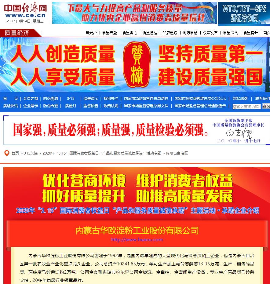 “誠信”是企業(yè)成長的“根”,“質(zhì)量”是企業(yè)發(fā)展之“本”,華歐公司積極開展企業(yè)內(nèi)部誠信體系建設(shè)。華歐公司為國內(nèi)高端薯類淀粉的領(lǐng)軍企業(yè)、標桿企業(yè),公司生產(chǎn)的“華歐”牌馬鈴薯淀粉經(jīng)過20多年的市場磨煉已經(jīng)是國內(nèi)同行業(yè)最具競爭力、最具影響力的品牌。公司嚴格執(zhí)行六大質(zhì)量管理融合體系即出口衛(wèi)生質(zhì)量安全管理體系包括生產(chǎn)許可SC,出口衛(wèi)生體系,ISO9001質(zhì)量管理體系,ISO22000食品安全管理體系,美國FDA認證等六大管理體系有效融合;推行全面質(zhì)量管理TQM體系,實現(xiàn)全過程、全員質(zhì)量管理。公司成立生產(chǎn)質(zhì)量HACCP管理小組,形成質(zhì)量管理ERP數(shù)據(jù)分析系統(tǒng),生產(chǎn)質(zhì)量管理過程形成數(shù)據(jù)化分析系統(tǒng),所有數(shù)據(jù)即時分析,持續(xù)改進。