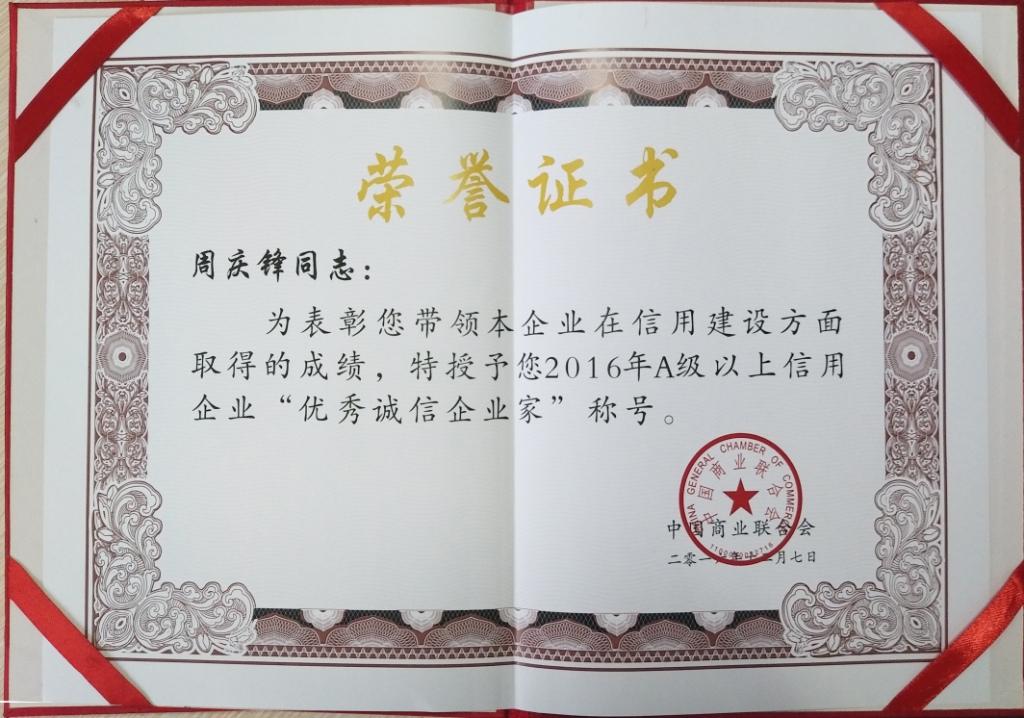 2016年12月7日,華歐公司董事長(zhǎng)周慶鋒被中國商業(yè)聯(lián)合會(huì)授予2016年A級(jí)以上信用企業(yè)“優(yōu)秀誠信企業(yè)家”稱號(hào)。