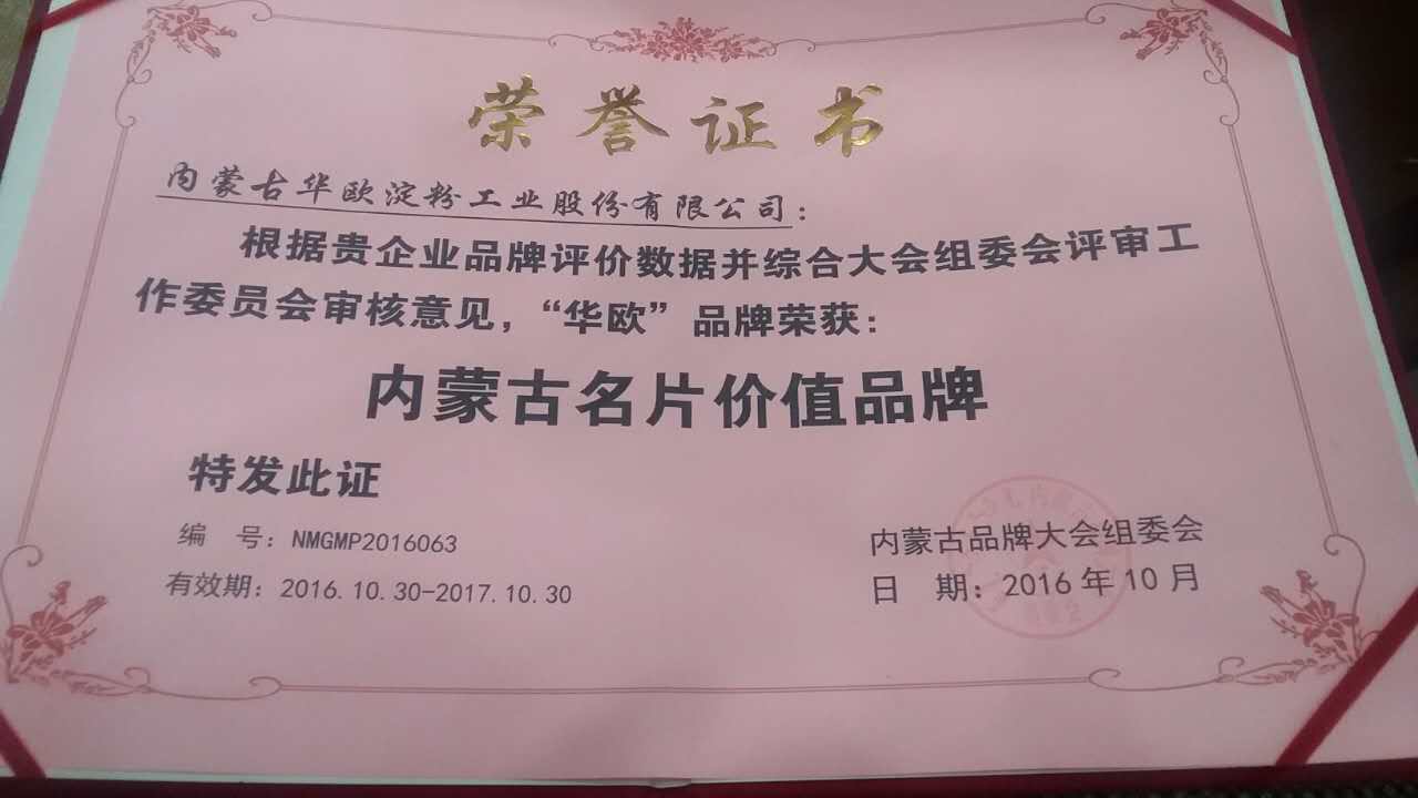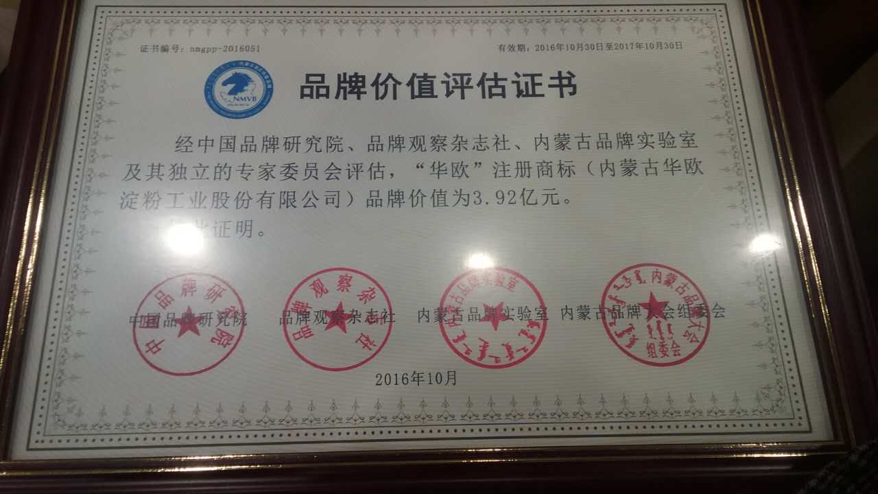10月30日,第三屆內(nèi)蒙古品牌大會在呼和浩特召開。內(nèi)蒙古華歐淀粉工業(yè)股份有限公司榮獲“內(nèi)蒙古名片價值品牌”,專家評估華歐品牌價值為3.92億元。